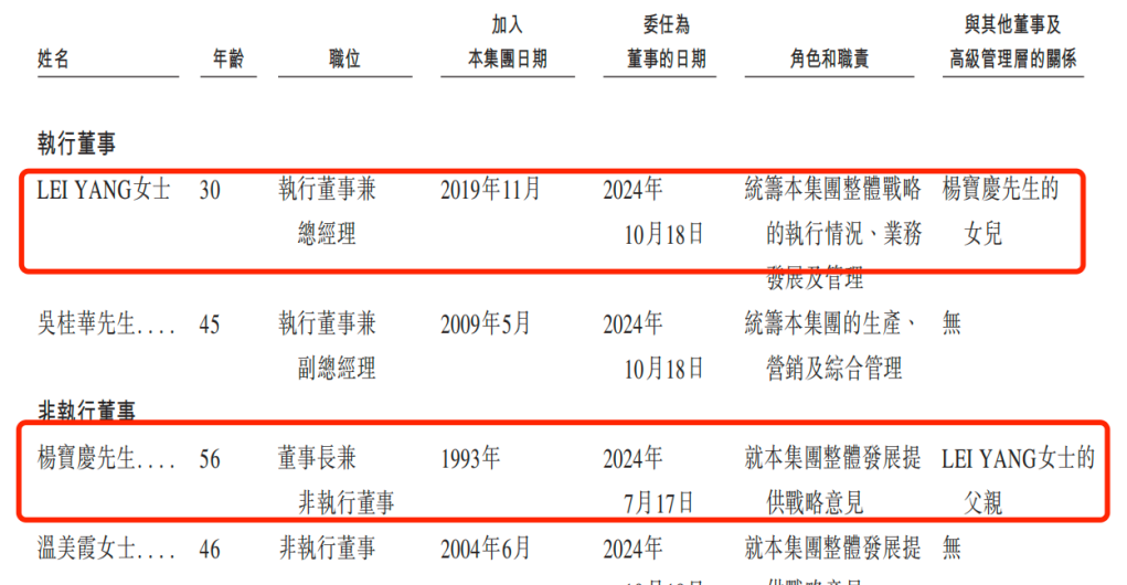 目前,杨宝庆在乐欣户外担任董事长兼非执行董事,其女LEI YANG今年30岁,担任公司执行董事兼总经理。
