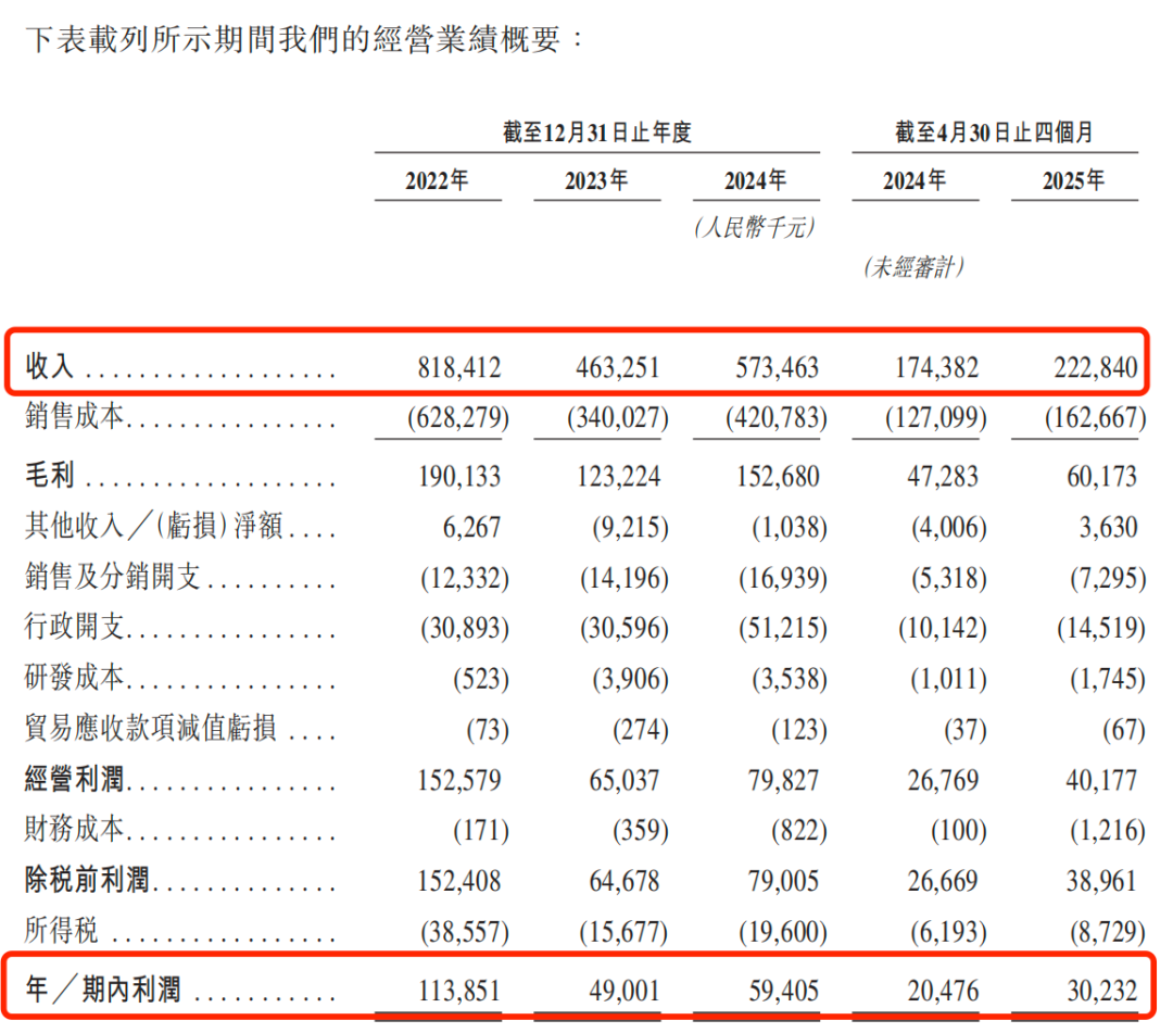 2022年至2025年4月30日(以下简称“报告期”),乐欣户外的收入分别为8.18亿元、4.63亿元、5.73亿元和2.23亿元。2023年,公司收入较2022年几乎“腰斩”,2024年收入有所回升,但较2022年仍然有很大差距。