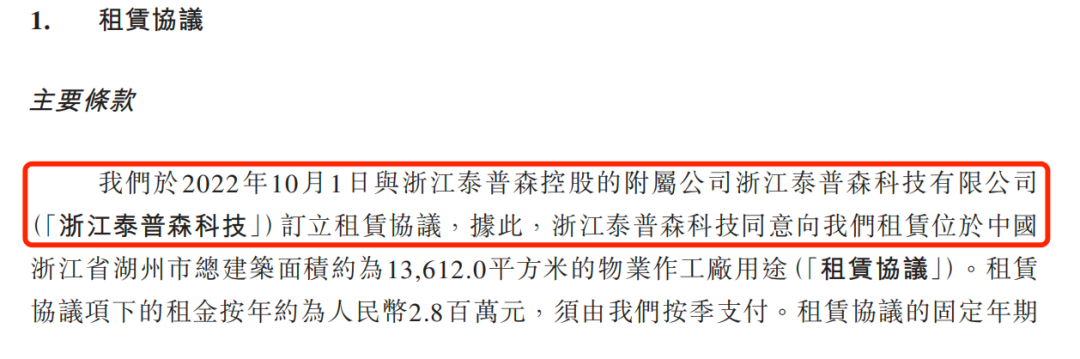 据悉,2022年10月,乐欣户外与浙江泰普森控股附属公司浙江泰普森科技签订租赁协议,租赁其1.36万平方米物业,年租金280万元。