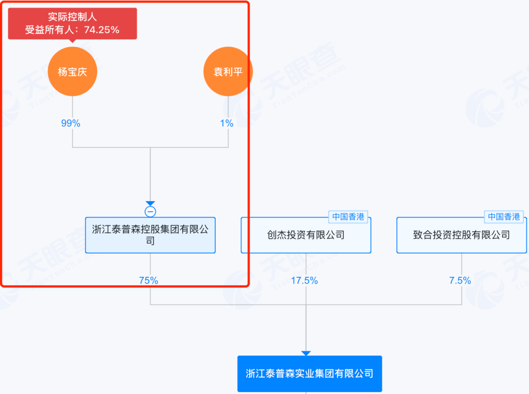 天眼查显示,杨宝庆和妻子袁利平通过浙江泰普森控股,间接持有浙江泰普森实业75%的股份。也就是说,这6500万元中的多半都进入了杨宝庆夫妇的“口袋”。