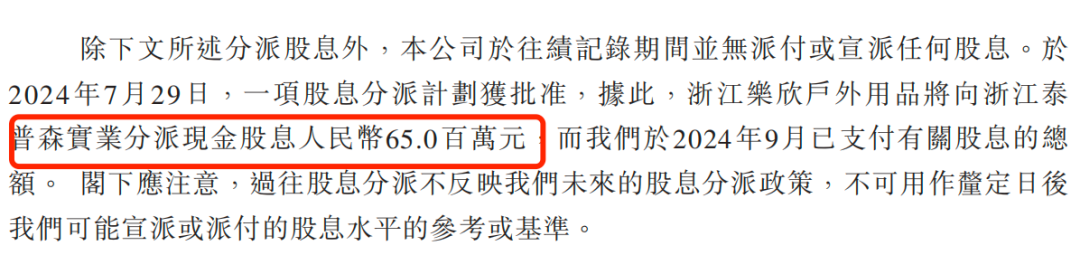 除了互相租赁物业外,2024年7月29日,乐欣户外还向浙江泰普森实业分派现金股息6500万元。