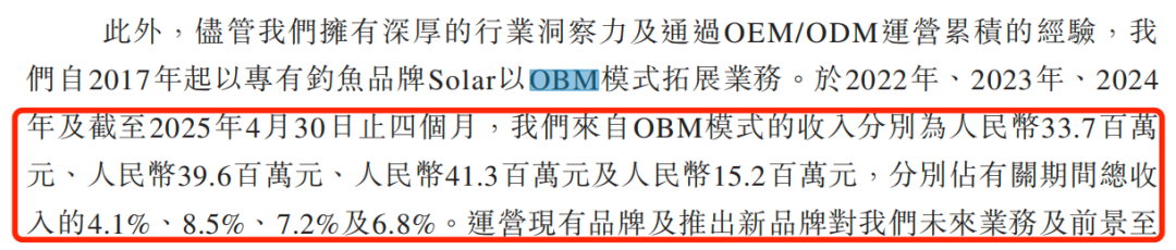 报告期内,公司来自OBM模式的收入分别约为3370万元、3960万元、4130万元和1520万元,占当期收入的比例分别为4.1%、8.5%、7.2%和6.8%。