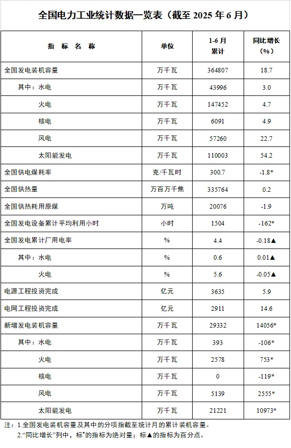 7月23日,国家能源局发布1-6月份全国电力工业统计数据。