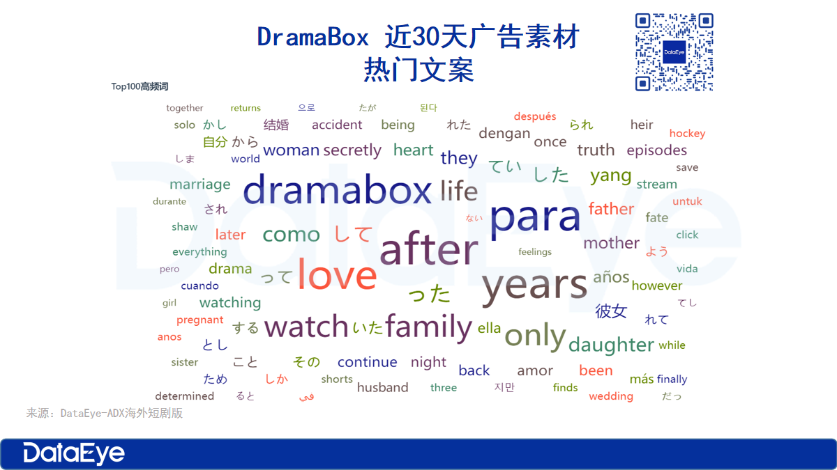 从投放素材高频词来看,近一个月,DramaBox投放微短剧中多出现亲情、家庭、爱等元素,并强调时间的跨越,这与其近一个月投放的微短剧类型有关。近一个月,DramaBox投放微短剧多为言情、亲情、家庭伦理等题材。同时,高频词英语含量较高,日语、韩语、西班牙语含量较少,主要与投放国家或地区有关。