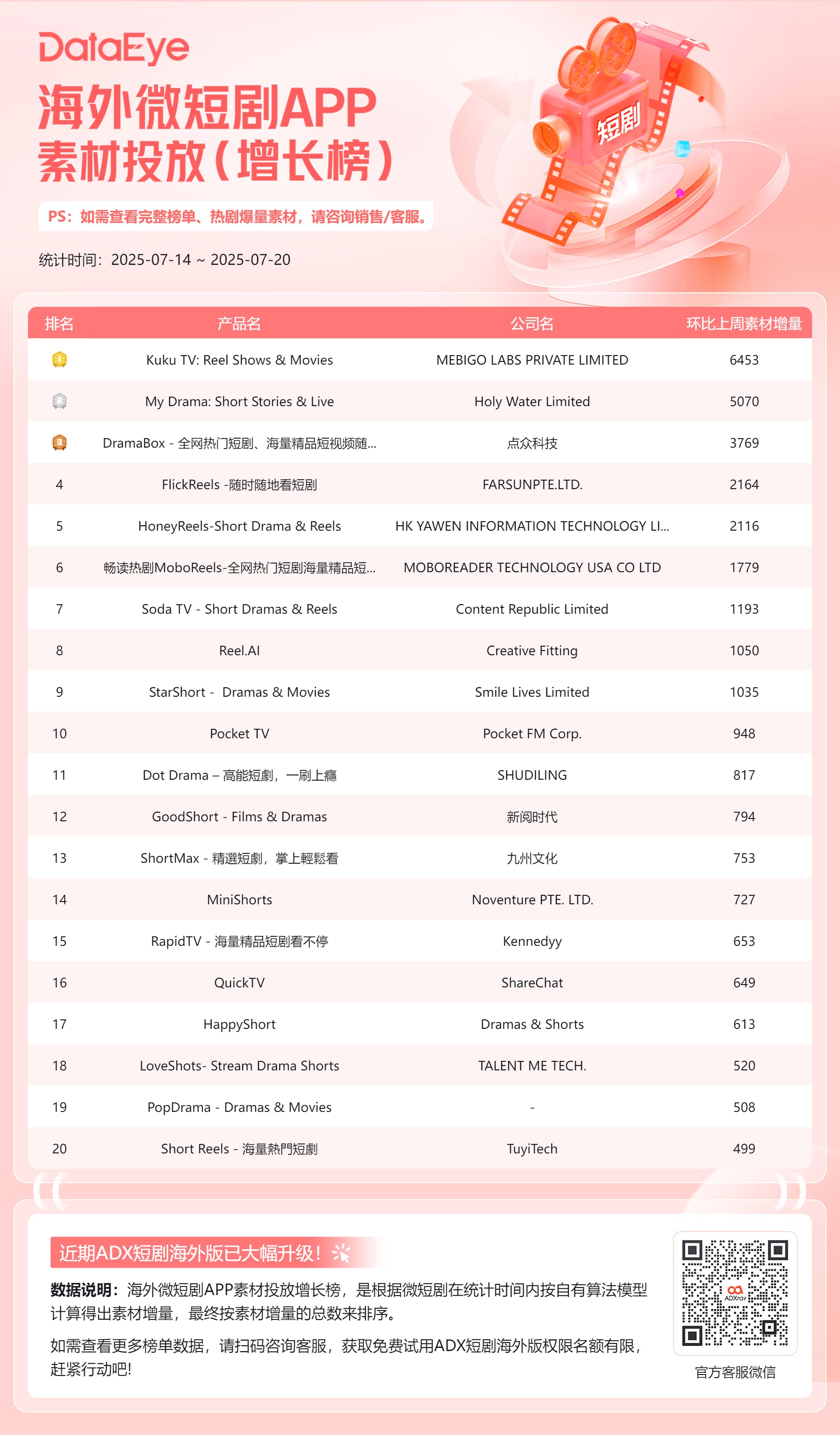本期(7月14日-7月20日)DataEye海外微短剧APP素材投放增长榜Kuku TV登顶;My Drama第二;DramaBox位列第三。