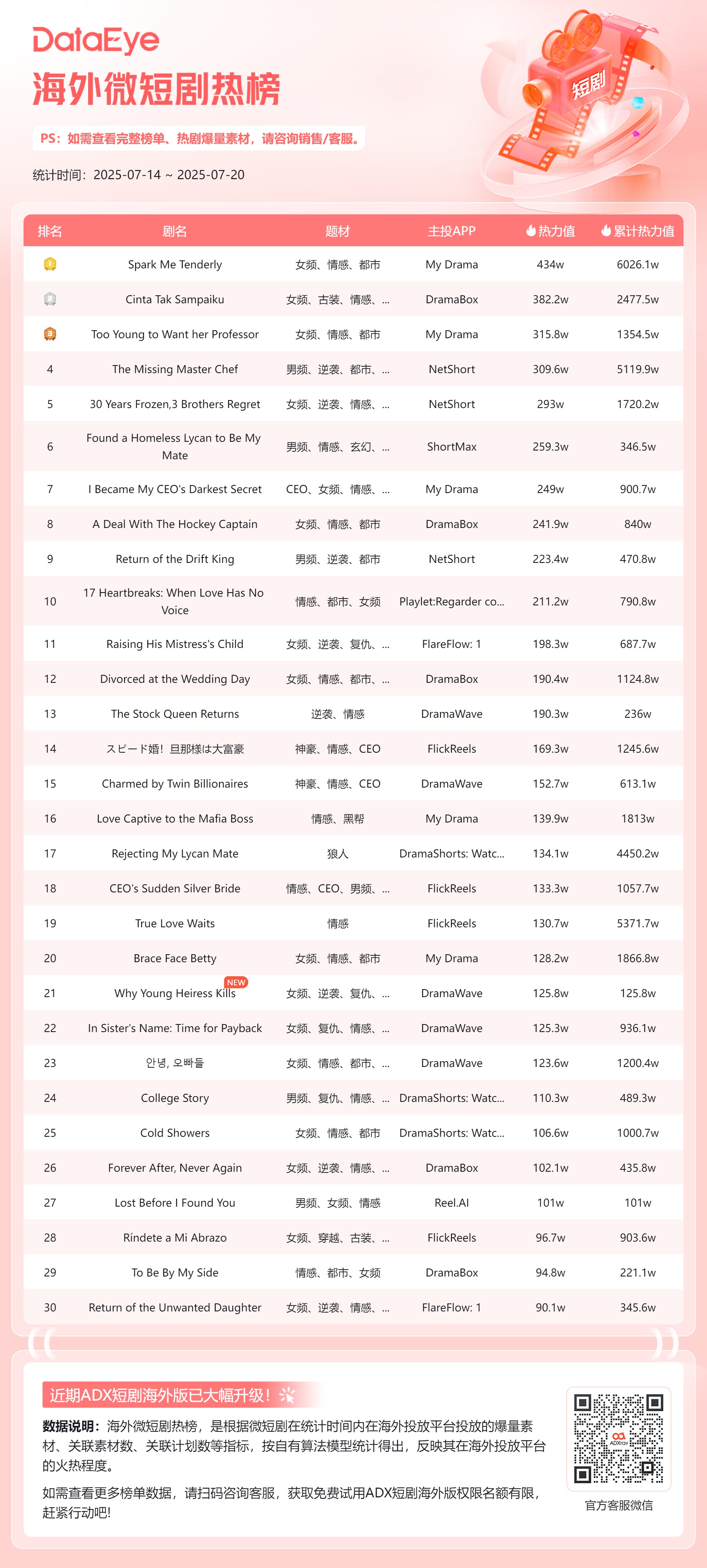 本期(7月14日-7月20日)DataEye海外微短剧热榜,《Spark Me Tenderly》登顶,热值达434万;《Cinta Tak Sampaiku》第二,热值达382.2万;《Too Young to Want her Professor》位列第三,热值达315.8万。
