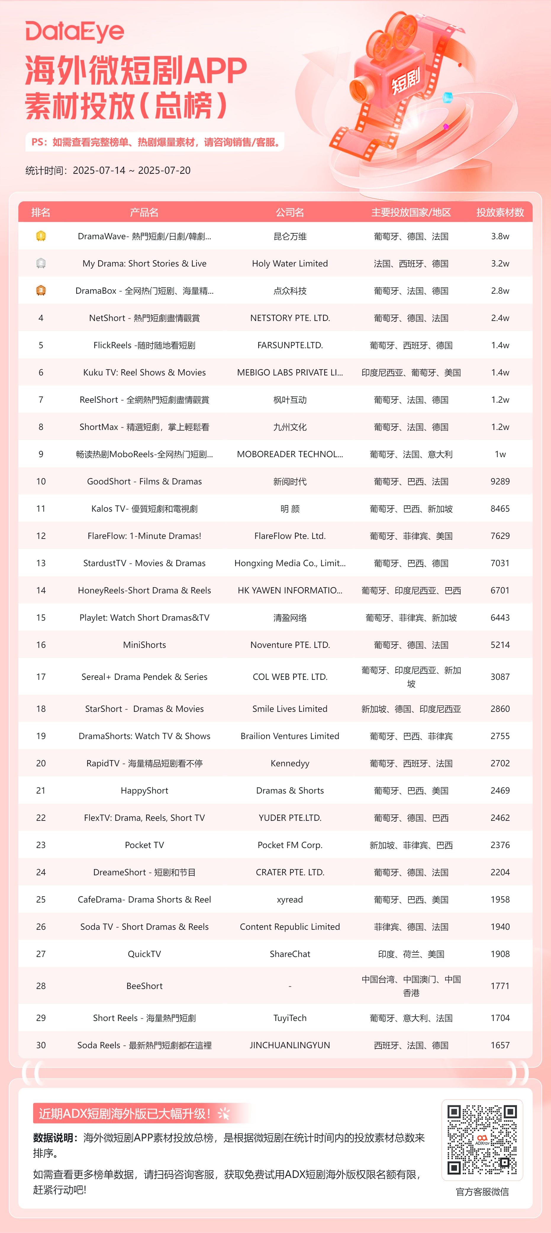 本期(7月14日-7月20日)DataEye海外微短剧APP素材投放榜,DramaWave排名第一;My Drama第二;DramaBox位列第三。