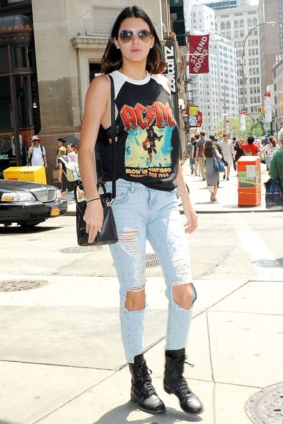 此外除了乐队Tee,Kendall Jenner在日常的街拍中还会穿着NBA的复古款纪念Tee。像是她被Harper’s Bazaar评为最佳街拍之一的照片就是穿着复古款的湖人队T恤。想要尝试这种酷酷的复古风潮的姑娘不妨将男友的早些年篮球纪念Tee翻出来穿,Oversized的款式也正好符合当下的潮流。