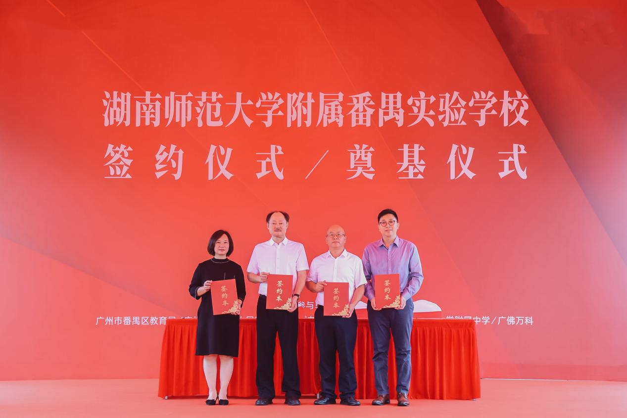 7月23日,湖南师大附中与广州市番禺区教育局及万科正式签订合作办学协议,成立广州番禺校区。该学校规划为九年制公办,共36个班级,计划将在2027年9月开学。签约当天同步举办了学校的奠基仪式,据现场介绍,学校将于今年年底封顶。(学校最终开学时间及招生政策以教育局当年公布为准。)