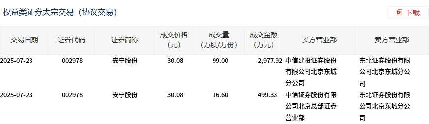 7月23日,安宁股份大宗交易成交115.6万股,成交额3477.25万元,占当日总成交额的11.48%,成交价30.08元,较市场收盘价30.67元折价1.92%。