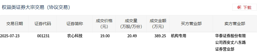 7月23日,农心科技大宗交易成交20.49万股,成交额389.25万元,占当日总成交额的12.56%,成交价19元,较市场收盘价20.59元折价7.72%。