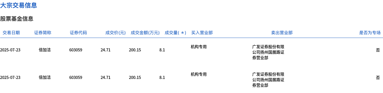 7月23日,倍加洁大宗交易成交16.2万股,成交额400.3万元,占当日总成交额的9.82%,成交价24.71元,较市场收盘价27.36元折价9.69%。