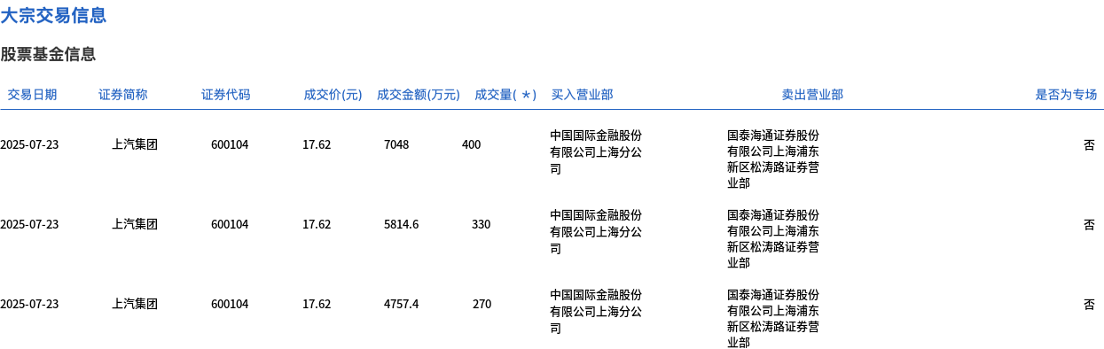 7月23日,上汽集团大宗交易成交1000万股,成交额1.76亿元,占当日总成交额的10.8%,成交价17.62元,较市场收盘价17.8元折价1.01%。
