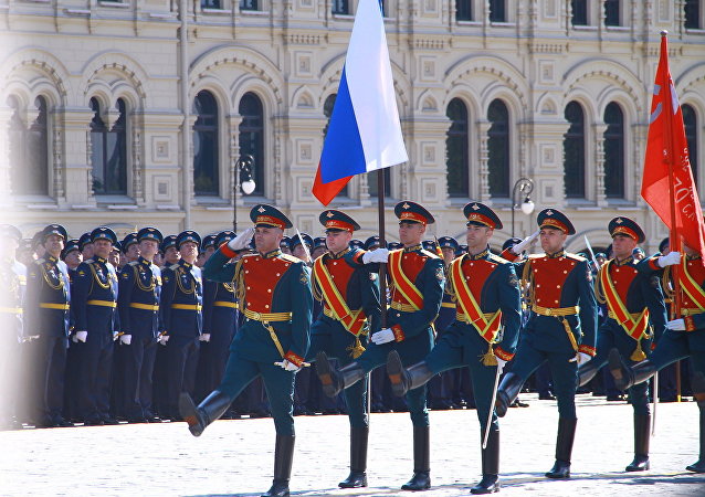 第154普列奥布拉任斯基独立警备团仪仗营旗帜护卫队在亚历山大罗夫《神圣的战争》乐曲伴奏下,将俄罗斯联邦国旗和胜利旗帜擎入红场。