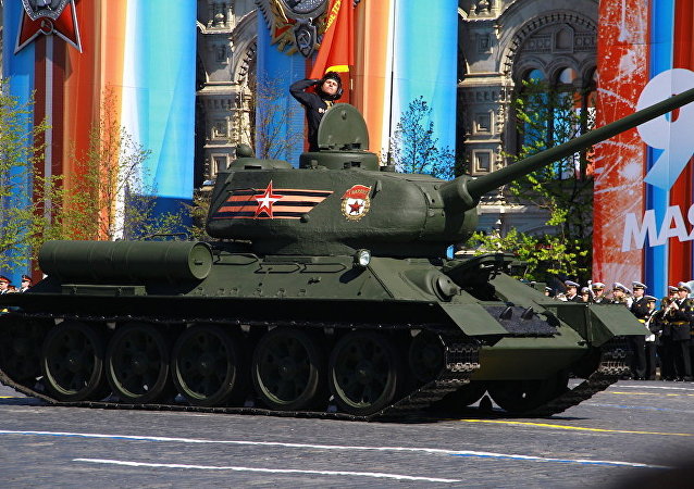 卫国战争中最好的坦克T-34坦克接受检阅,这些坦克曾是近卫坦克部队的主要装备。