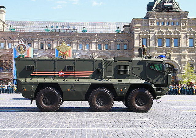 俄罗斯武装力量的现代化装备接受检阅。首先通过的是多用途“虎式-M”装甲汽车纵队。在装甲汽车上可安装从射击武器到反坦克武器在内的各种战斗模块。因此,可在各种战斗条件下使用。