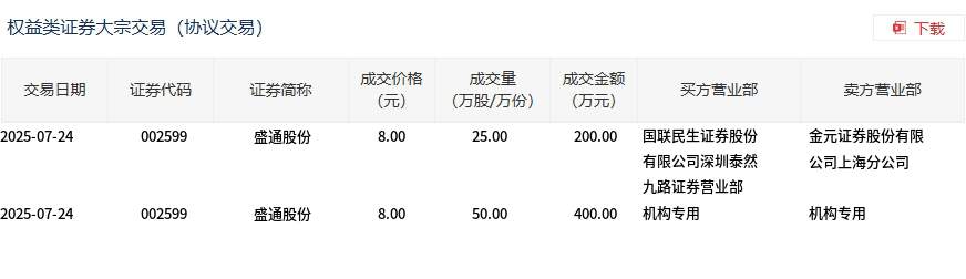 7月24日,盛通股份大宗交易成交75万股,成交额600万元,占当日总成交额的4.04%,成交价8元,较市场收盘价8.82元折价9.3%。
