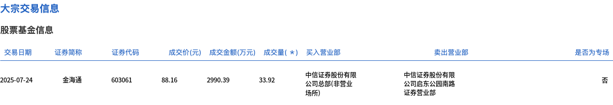 7月24日,金海通大宗交易成交33.92万股,成交额2990.39万元,占当日总成交额的18.62%,成交价88.16元,较市场收盘价89.68元折价1.69%。