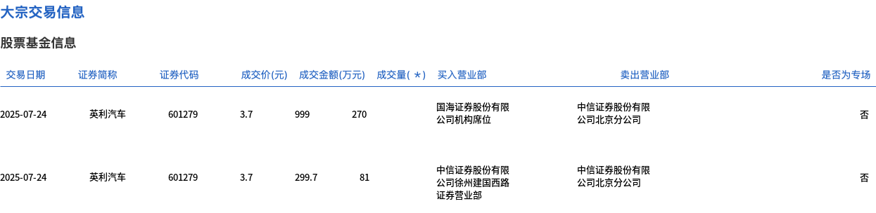 7月24日,英利汽车大宗交易成交351万股,成交额1298.7万元,占当日总成交额的8.9%,成交价3.7元,较市场收盘价4.15元折价10.84%。