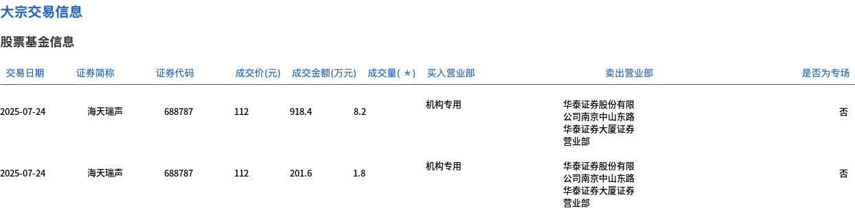 7月24日,海天瑞声大宗交易成交10万股,成交额1120万元,占当日总成交额的1.86%,成交价112元,较市场收盘价132.88元折价15.71%。