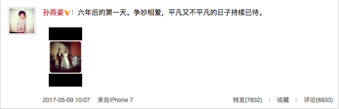 5月9日,孙燕姿在微博上发文称“六年后的第一天。争吵相爱,平凡又不平凡的日子持续已待”。庆祝与老公的结婚六周年纪念日。并配上一张结婚时的美照。