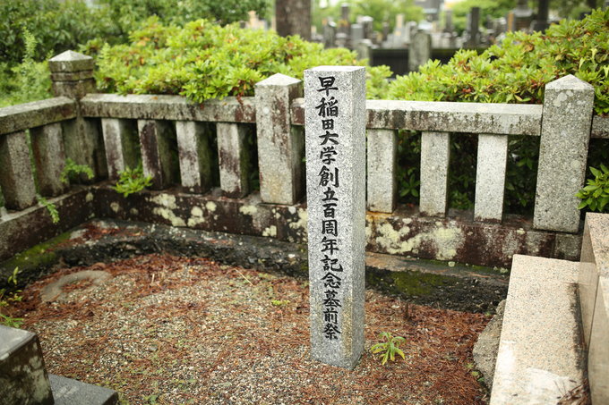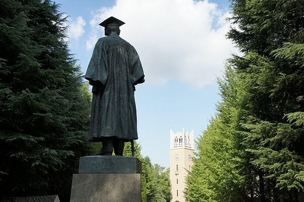 早稻田校园里矗立着一尊大隈重信铜像,他身穿长袍,头戴具有早稻田大学特色的学士角帽,左手扶着拐杖,巍然屹立在银杏树下。不过,他紧闭嘴唇,一言不发,似乎在期待着人们从他的功业得失中获得启示。