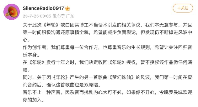 7月25日,汪苏泷对接号@SilenceRadio0917 微博发文:关于此次《年轮》歌曲因某博主不当话术引发的相关争议,我们本无意参与,并且第一时间积极沟通还原事情全貌,希望能减少负面舆论,但发现仍不断掉进风波中心。作为创作者,我们尊重每一位合作方,也尊重音乐的生长规则,希望让关注回归音乐本身。在《年轮》发行十年之时,我们决定收回《年轮》授权,暂不授权该作品做任何演唱。同时,关于因《年轮》产生的另一首歌曲《梦幻诛仙》的风波,我们第一时间在查询合约后,确认这首歌曲也是双原唱。