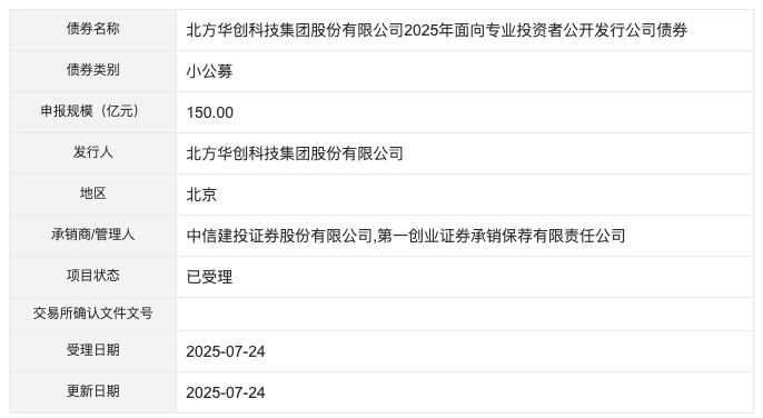 深交所项目进度信息显示,北方华创科技集团股份有限公司150亿元小公募债项目状态更新为“已受理”,受理日期为2025年7月24日。募集说明书申报显示,本次公司债券的募集资金扣除发行费用后拟用于补充营运资金、偿还公司到期债务、项目建设、权益投资及符合法律法规允许的其他用途。