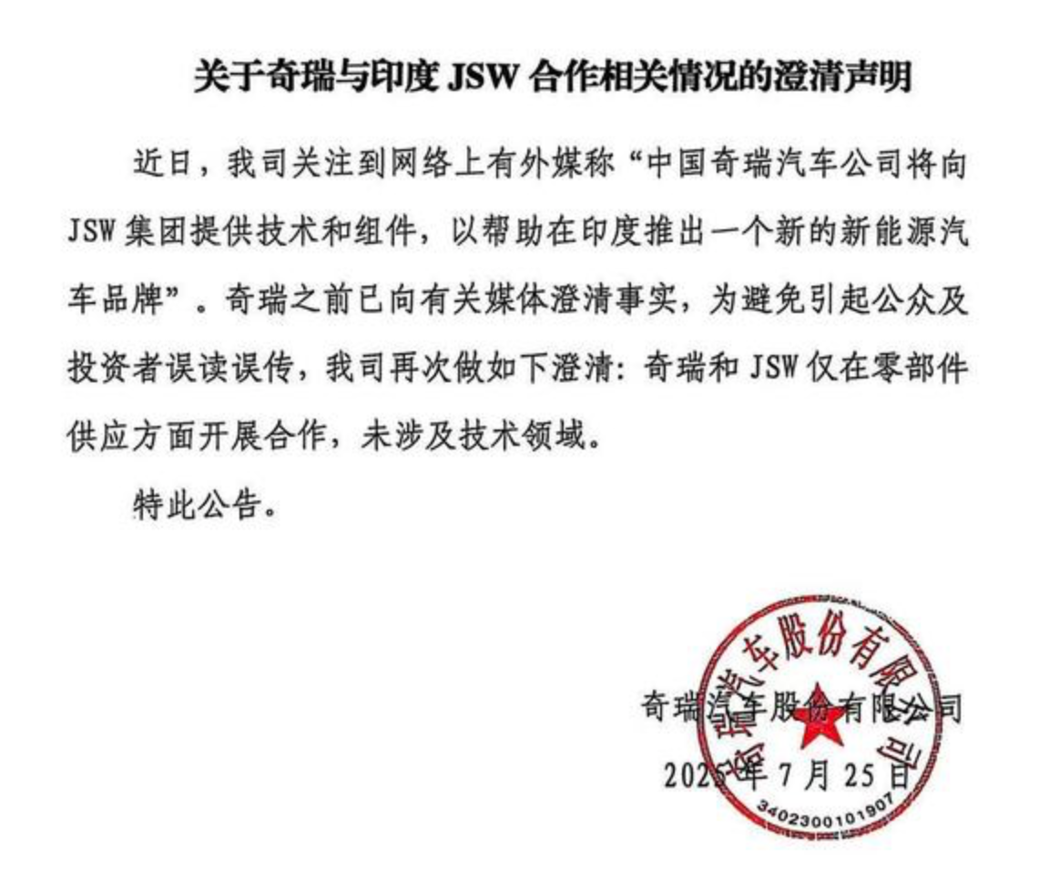 7月25日,奇瑞汽车发布声明称,公司近日关注到网络上有外媒称“中国奇瑞汽车公司将向JSW集团提供技术和组件,以帮助在印度推出一个新的新能源汽车品牌”。奇瑞之前已向有关媒体澄清事实,为避免引起公众及投资者误读误传,公司再次做如下澄清:奇瑞和JSW仅在零部件供应方面开展合作,未涉及技术领域。