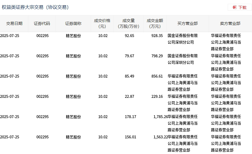 7月25日,精艺股份大宗交易成交614.86万股,成交额6160.89万元,占当日总成交额的40.24%,成交价10.02元,较市场收盘价9.64元溢价3.94%。