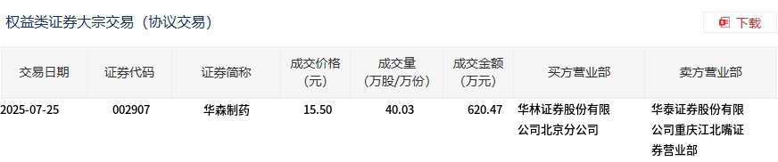 7月25日,华森制药大宗交易成交40.03万股,成交额620.47万元,占当日总成交额的1.49%,成交价15.5元,较市场收盘价17.33元折价10.56%。
