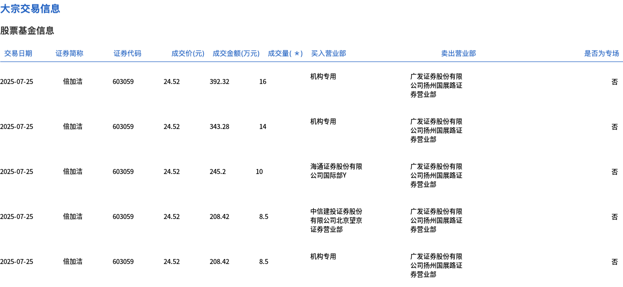 7月25日,倍加洁大宗交易成交57万股,成交额1397.64万元,占当日总成交额的29.33%,成交价24.52元,较市场收盘价27.24元折价9.99%。