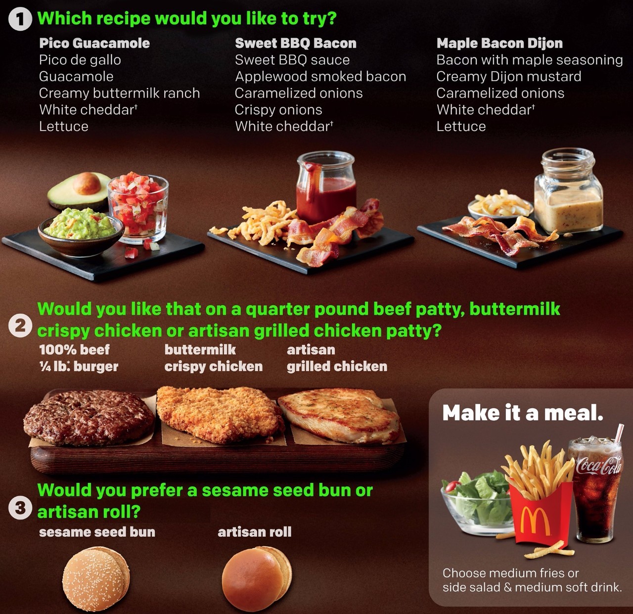 二是提供一些固定的款式,店家经过多次试验甚至市场检验,反响不错的出品可以为初来乍到或者罹患选择困难症的消费者提供轻松的“入门级”选择,这也比较能保证他们手里拿到的产品质量——这也是为什么从去年开始,麦当劳调整了战略,在美国他们推出了“招牌手工食谱”系列,消费者在四个复合风味里选择一款,然后自选肉类和面包,手续大为简化。