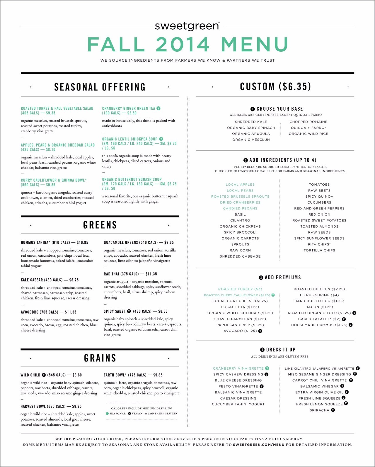 (Sweetgreen 菜单示范,左边是固定搭配,右边是自选配料)