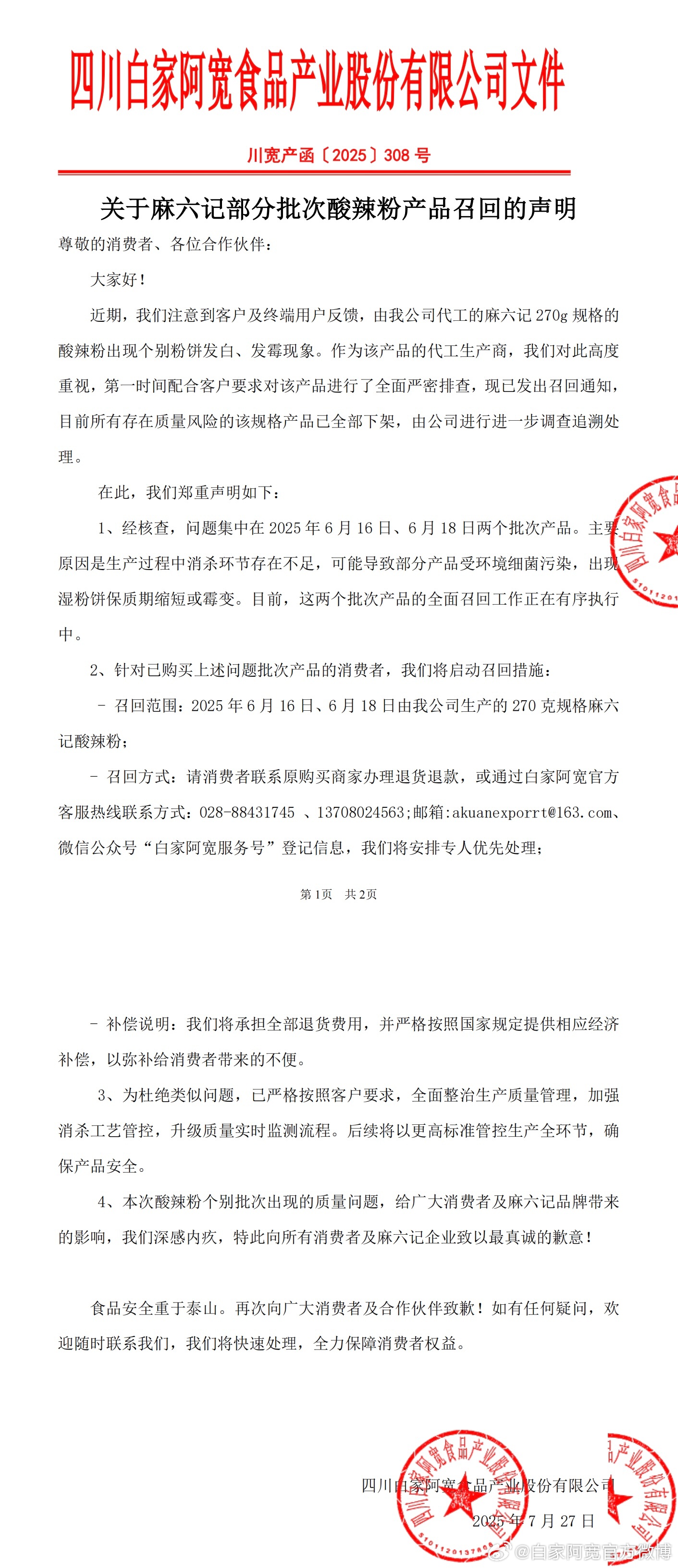 近期,有多名网友在社交平台发文称,“开市客超市下架麻六记酸辣粉产品,并做出召回处理”,引发热议。对此,7月27日,产品代工厂商@白家阿宽官方微博 发布声明称,注意到客户及终端用户反馈,由公司代工的麻六记270g规格的酸辣粉出现个别粉饼发白、发霉现象。公司第一时间配合客户要求对该产品进行了全面严密排查,现已发出召回通知,目前所有存在质量风险的该规格产品已全部下架,由公司进行进一步调查追溯处理。