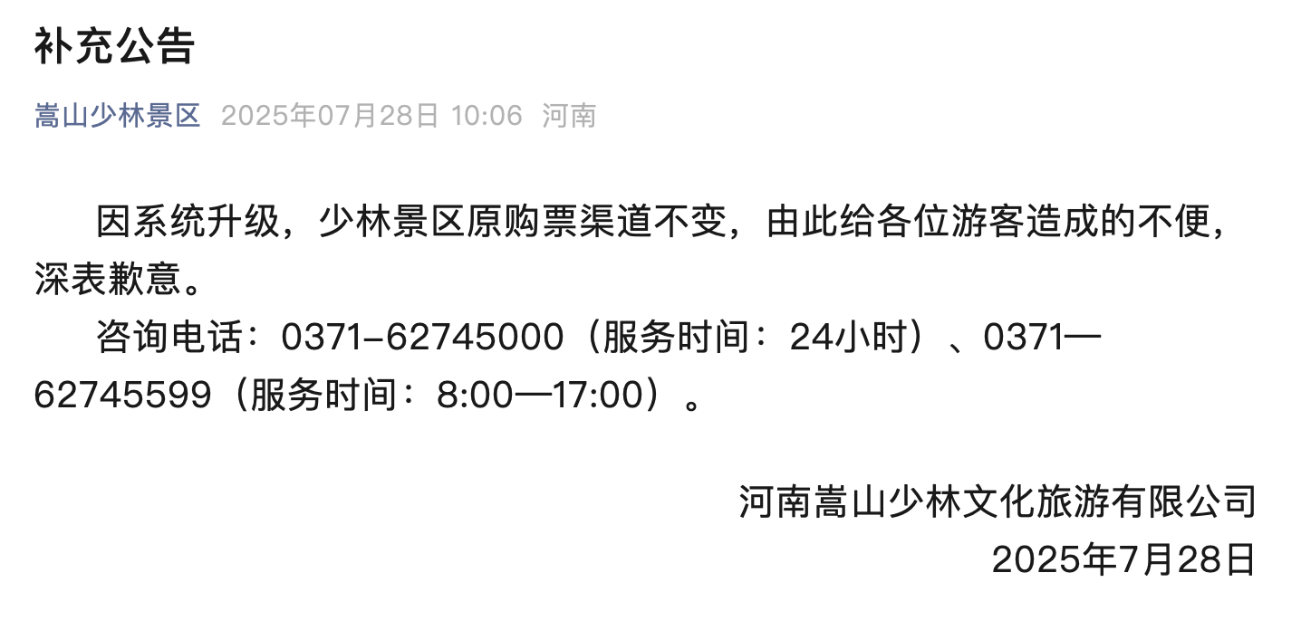 7月28日,河南嵩山少林文化旅游有限公司发布补充公告:因系统升级,少林景区原购票渠道不变,由此给各位游客造成的不便,深表歉意。咨询电话:0371-62745000(服务时间:24小时)、0371—62745599(服务时间:8:00—17:00)。