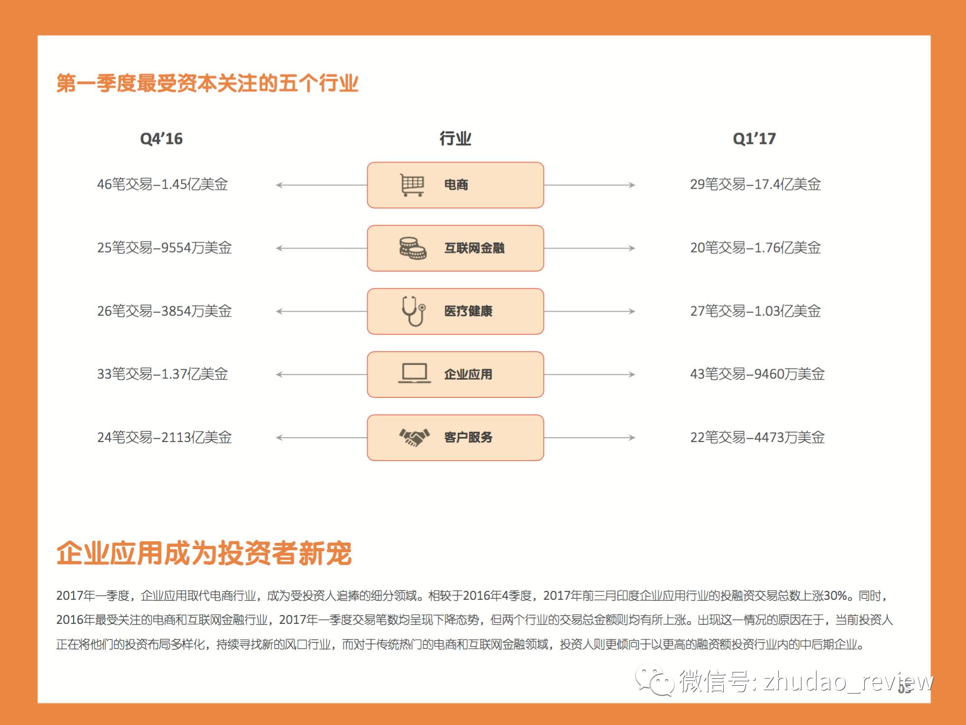 2017年一季度,企业应用取代电商行业,成为受投资人追捧的细分领域。相较于2016年4季度,2017年前三月印度企业应用行业的投融资交易总数上涨30%。