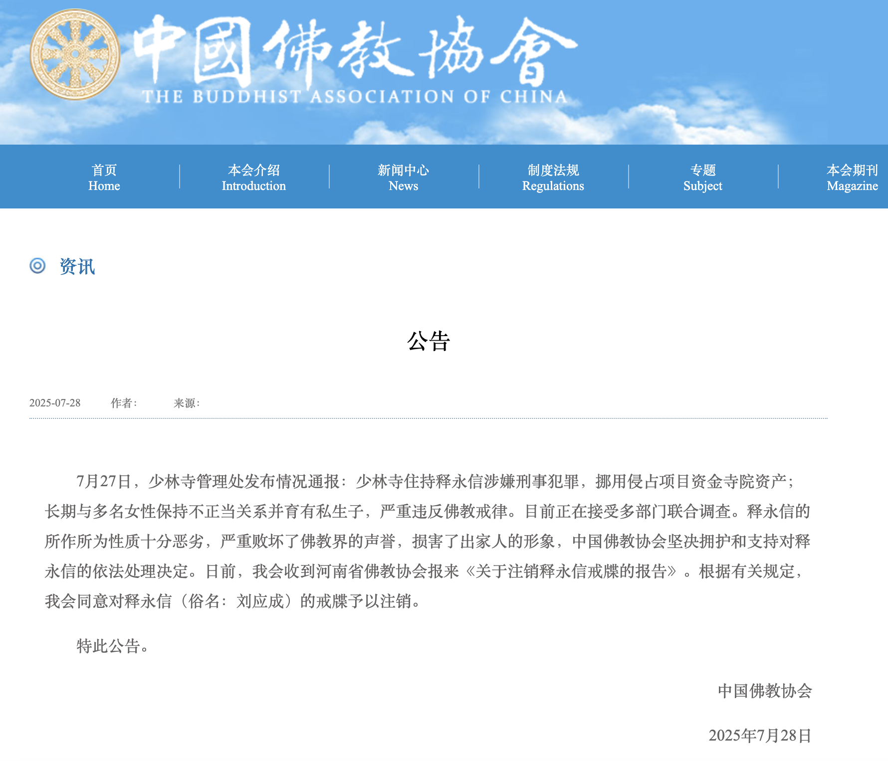 中国佛教协会发布公告,7月27日,少林寺管理处发布情况通报:少林寺住持释永信涉嫌刑事犯罪,挪用侵占项目资金寺院资产;长期与多名女性保持不正当关系并育有私生子,严重违反佛教戒律。目前正在接受多部门联合调查。释永信的所作所为性质十分恶劣,严重败坏了佛教界的声誉,损害了出家人的形象,中国佛教协会坚决拥护和支持对释永信的依法处理决定。日前,我会收到河南省佛教协会报来《关于注销释永信戒牒的报告》。根据有关规定,我会同意对释永信(俗名:刘应成)的戒牒予以注销。