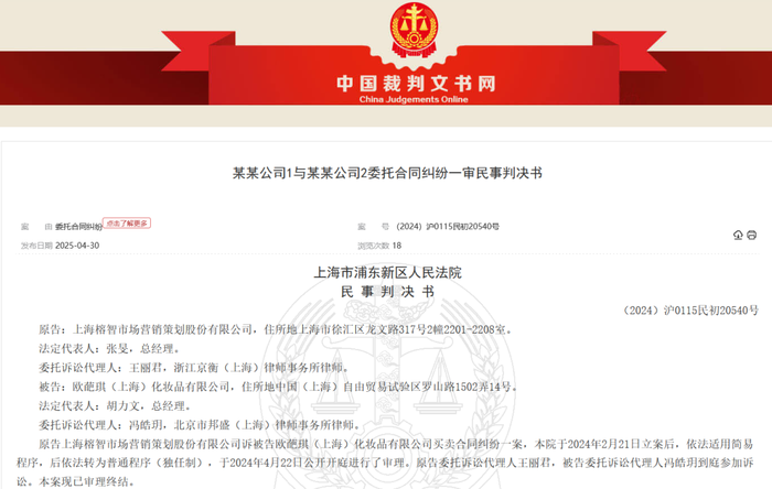 其中,据中国裁判文书网披露,起诉方上海榕智曾与欧邦琪中国关联公司上海欧葩琪签订《欧邦琪2023年Q1广告发布合同》,合同总金额为270万元,但在其履行全部合同义务后,上海欧葩琪因迟迟未付清合同款项,被判处向上海榕智支付合同款230万元及利息。