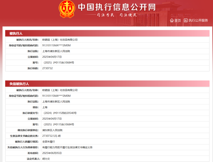 最终,上海欧葩琪因全部未履行被列入失信执行人,并被限制高消费,具体情形为“有履行能力而拒不履行生效法律文书确定义务”。