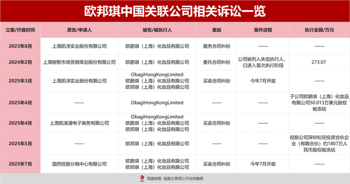 据青眼不完全梳理,2023年至今,欧邦琪中国关联公司先后被凯淳股份、国药控股分销中心有限公司、上海榕智市场营销策划股份有限公司(下称:上海榕智)等多家公司以合同纠纷为由起诉。