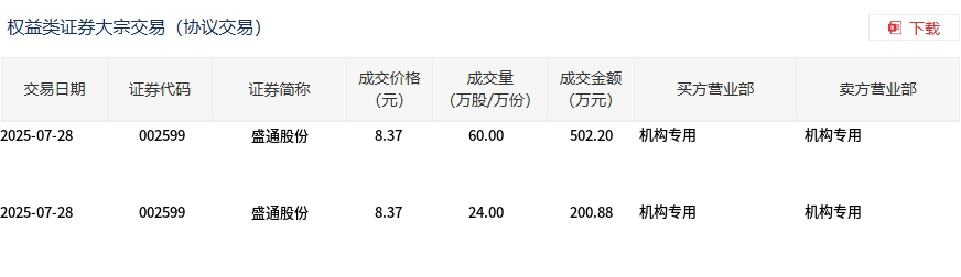 7月28日,盛通股份大宗交易成交84万股,成交额703.08万元,占当日总成交额的0.86%,成交价8.37元,较市场收盘价9.74元折价14.07%。