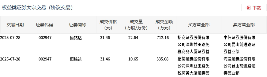 7月28日,恒铭达大宗交易成交33.29万股,成交额1047.24万元,占当日总成交额的3.1%,成交价31.46元,较市场收盘价34.28元折价8.23%。
