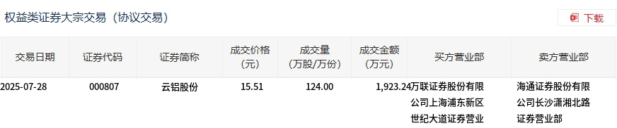 云铝股份今日大宗交易折价成交124万股,成交额1923.24万元