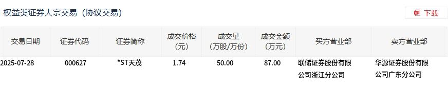 7月28日,*ST天茂大宗交易成交50万股,成交额87万元,占当日总成交额的0.4%,成交价1.74元,较市场收盘价1.62元溢价7.41%。