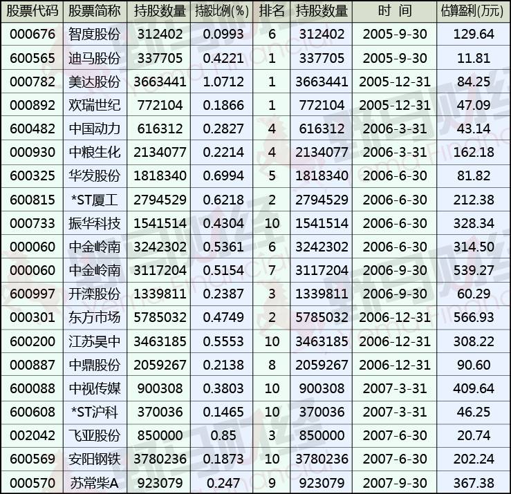 在整个牛市期间,马信琪延续了其短平快的风格,快进快出,换股频繁,截至2007年10月,其共持有过19只股票,除中金岭南外,其他股票持有时间均不超过1个季度。马信琪持股情况(占公司前十大流通股情况,排名为流通股股东排名,下同)如下表所示: