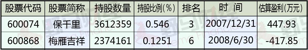从2007年底到2008年底,A股属于熊市阶段,上证指数从6124点高位跌破2000点,市场哀鸿遍野,一片狼藉。而这一时期马信琪采取轻仓模式,操作相对较少,成功避开大熊市,他现身的前十大流通股只有保千里(600074.SH,曾用名:中达股份)和梅雁吉祥(600868.SH)两只股票,持股市值分别为2835.7万和645.8万。马信琪这一时期持股情况如下表所示: