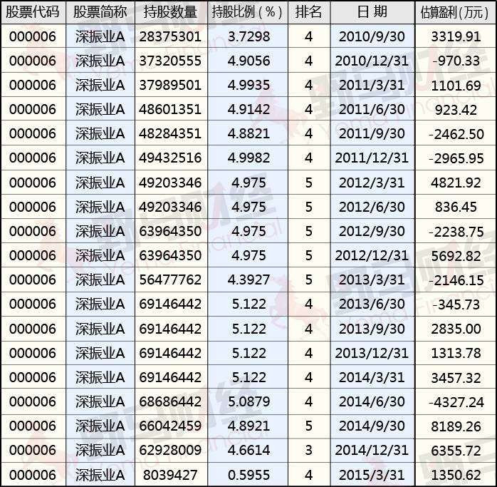 值得一提的是,这一时期马信琪多次出现在深振业A前十大流通股名单中。从2010年三季报马信琪出现在深振业A前十大流通股名单中,直到2015年一季报时,才从深振业A前十大流通股名单中消失,持股周期长达4年之久,累计盈利约2.47亿元。马信琪持股深振业A的具体情况见下表所示: