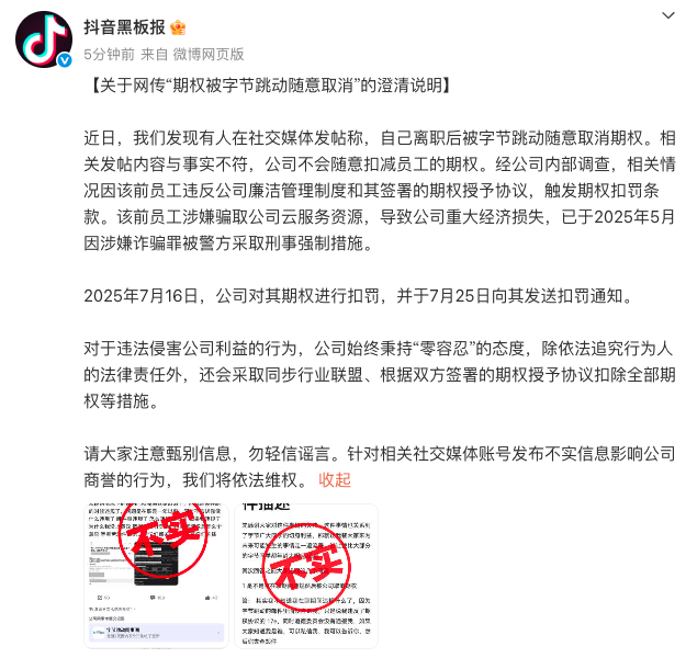 7月28日下午,@抖音黑板报 发布关于网传“期权被字节跳动随意取消”的澄清说明:近日,我们发现有人在社交媒体发帖称,自己离职后被字节跳动随意取消期权。相关发帖内容与事实不符,公司不会随意扣减员工的期权。经公司内部调查,相关情况因该前员工违反公司廉洁管理制度和其签署的期权授予协议,触发期权扣罚条款。该前员工涉嫌骗取公司云服务资源,导致公司重大经济损失,已于2025年5月因涉嫌诈骗罪被警方采取刑事强制措施。2025年7月16日,公司对其期权进行扣罚,并于7月25日向其发送扣罚通知。