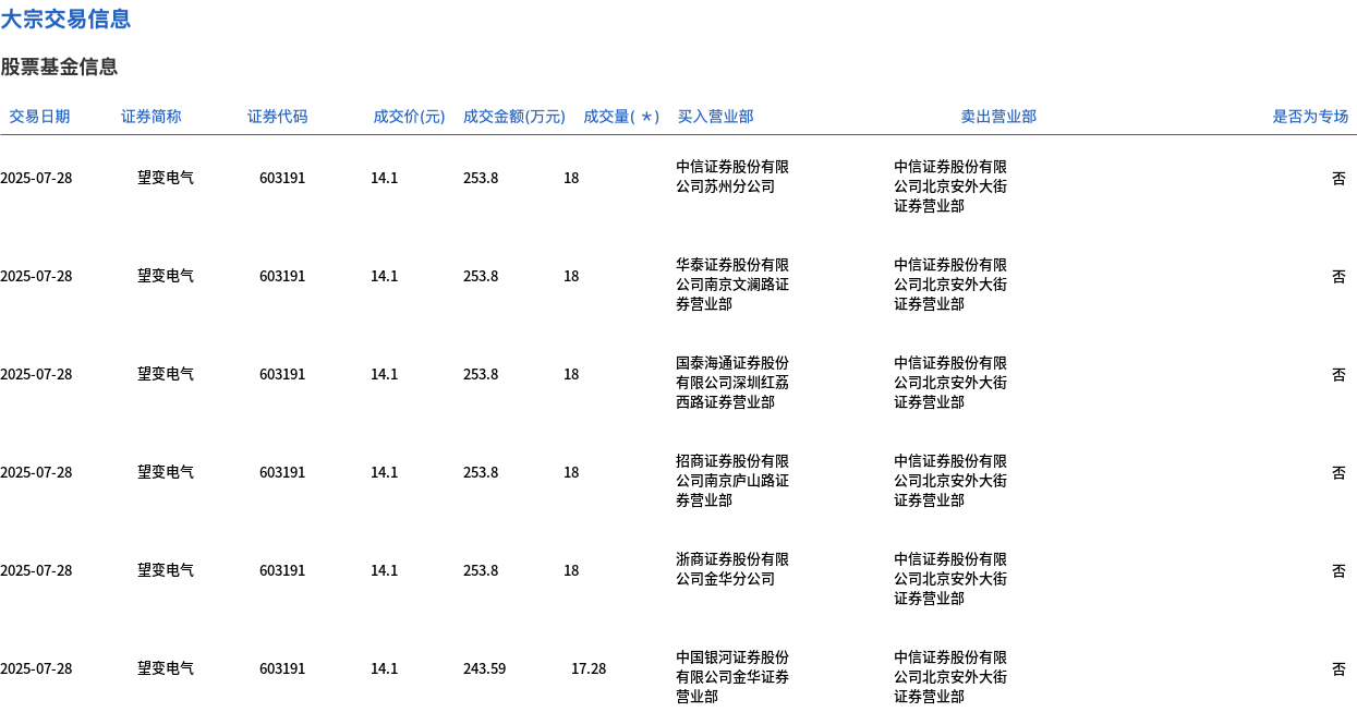 7月28日,望变电气大宗交易成交208.28万股,成交额2941.94万元,占当日总成交额的5.02%,成交均价14.12元,较市场收盘价16.3元折价13.34%,其中最高成交价14.45元,最低成交价14.1元。